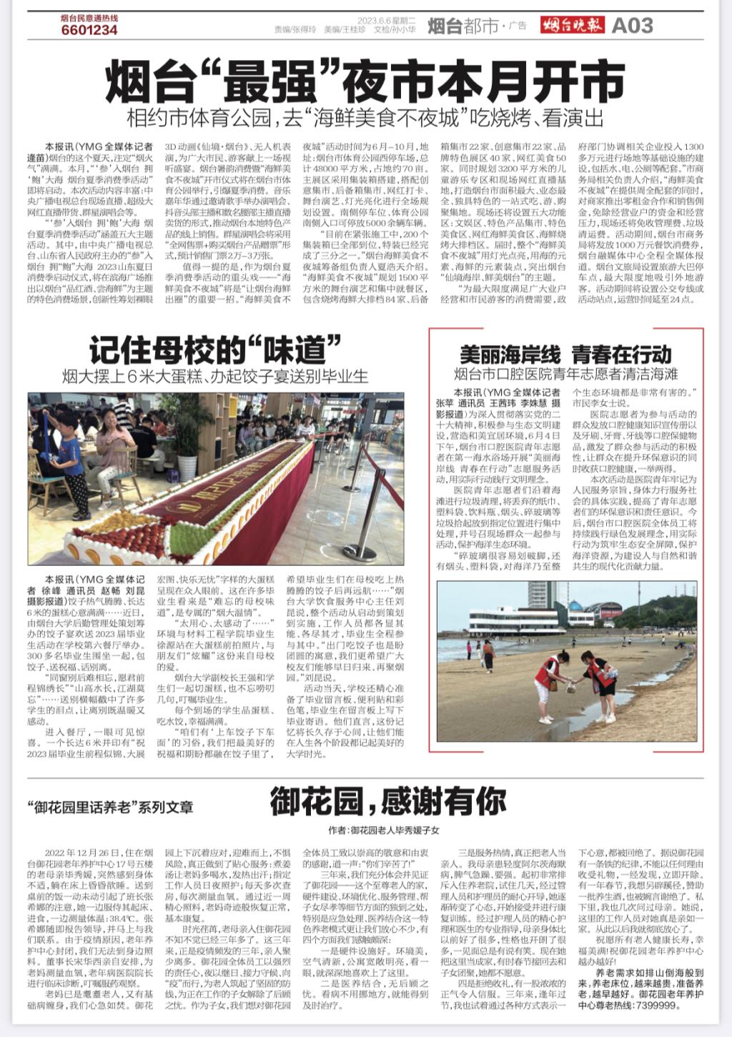 包裹著濃濃愛意的餃子熱氣騰騰,長達六米的蛋糕心意滿滿,氣氛熱烈的座談會上大家暢所欲言……6月2日下午,一場由煙臺大學后勤管理處策劃籌辦的餃子宴歡送2023屆畢業生活動在第六餐廳舉辦。前期通過線上報名的方式,共有300多名畢業生來到活動現場。大家圍坐在一起,包餃子、送祝福、話別離。對此,中國青年報客戶端、山東教育發布視頻號、山東教育新聞視頻號、齊魯壹點、山東教育新聞網、膠東在線等媒體發布了相關報道。