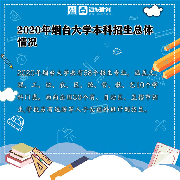 2020年,煙臺大學本科招生將面向山東、北京、上海、天津、河北、山西、內蒙古、遼寧、吉林、黑龍江、江蘇、浙江、安徽、福建、江西、河南、湖北、湖南、廣東、廣西、海南、重慶、四川、貴州、云南、陜西、甘肅、青海、寧夏、新疆等30個省(市、自治區)投放計劃。其中,山東省計劃投放普通本科招生計劃5320人、對口貫通分段培養轉段計劃293人,山東省外計劃投放本科招生計劃1810人。