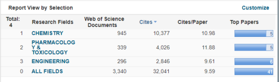ESI是衡量科學研究績效、跟蹤科學發展趨勢的基本分析評價工具,對全球所有高校及科研機構的SCIE、SSCI庫中近10年的論文數據進行統計,針對22個學科領域,通過論文數、論文被引頻次、論文篇均被引頻次、高被引論文、熱點論文和前沿論文等6大指標,從各個角度對國家/地區科研水平、機構學術聲譽、科學家學術影響力以及期刊學術水平進行全面衡量,每兩個月更新公布一次。ESI已成為當今世界范圍內普遍用以評價高校、學術機構、國家或地區國際學術水平及影響力的重要評價指標工具之一,我國教育主管部門也已以此作為評價高校學科發展的重要參考指標。