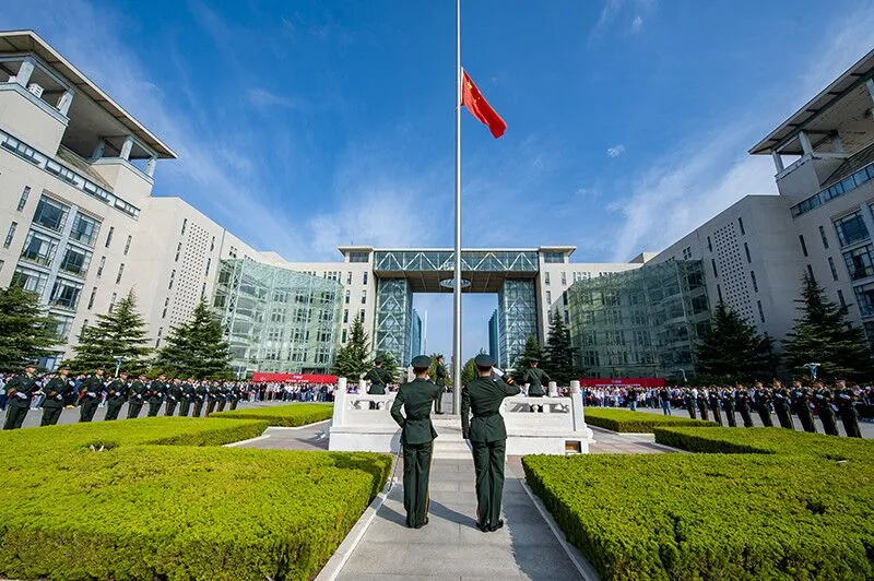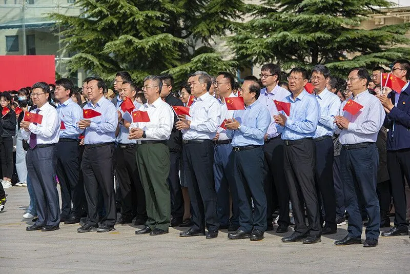 10月1日上午9時,鏗鏘有力的腳步聲在廣場上響起,在場師生屏氣凝神把目光投向國旗護衛隊走來的方向。由30名在校生組成的國旗護衛隊挺拔威武,邁著整齊的步伐,護衛國旗走向升旗臺。伴隨著威武雄壯的《義勇軍進行曲》,鮮紅的五星紅旗冉冉升起,在場師生齊唱國歌,肅立行注目禮,共同感受這一莊重而自豪的時刻。