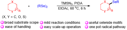 含硒雜環化合物具有重要的生物和藥理活性,在抗菌、抗腫瘤、心血管保護及免疫調節方面具有的重要作用。近日,我校化學化工學院有機方法學團隊,孫凱課題組利用PIDA/TMSN3氫原子轉移體系,成功實現了醚類化合物惰性C(sp3)-H的硒化反應,制備了系列結構多樣性的不對成硒醚化合物(Chem. Commun., 2022, 58, 1526)。孫凱為通訊作者,煙臺大學為第一單位;該研究得到了國家自然科學基金、煙臺大學拔尖人才計劃的資助。