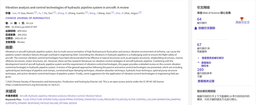 根據(jù)Essential Science Indicators(簡稱ESI)2023年7月公布的最新統(tǒng)計結(jié)果,我校機(jī)電汽車工程學(xué)院于濤教授團(tuán)隊“高端裝備動態(tài)設(shè)計與先進(jìn)制造技術(shù)”2021年發(fā)表于《Chinese Journal of Aeronautics》的論文《Vibration analysis and control technologies of hydraulic pipeline system in aircraft: A review》入選ESI高被引論文,論文以煙臺大學(xué)為第一署名單位,團(tuán)隊成員高培鑫教授為第一作者。