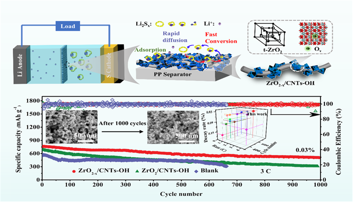 基于此,煙臺大學材料電化學過程與技術崔洪濤教授團隊借助-OH官能團的作用,采用氫刻蝕法成功制備了具有豐富氧空位的四方相ZrO2?x/CNTs-OH。通過電化學實驗輔助第一性原理計算發現,氧空位和納米結構可以有效的調控復合材料的電子結構,提高材料導電性,實現對多硫化物氧化還原反應的催化作用。同時,四方相ZrO2?x有助于鋰離子在電極表面的快速傳輸,CNTs-OH和ZrO2?x之間復合有利于電子在界面處的快速轉移。因此,該復合材料改性隔膜時,表現出優異的電化學性能。這種催化策略,不僅可以應用于鋰硫電池體系,也可應用于其他電池體系和超級電容器中。