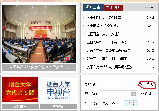 在瀏覽器中打開煙臺大學官網http://www.30nao40.xyz,點擊右下“計費系統”