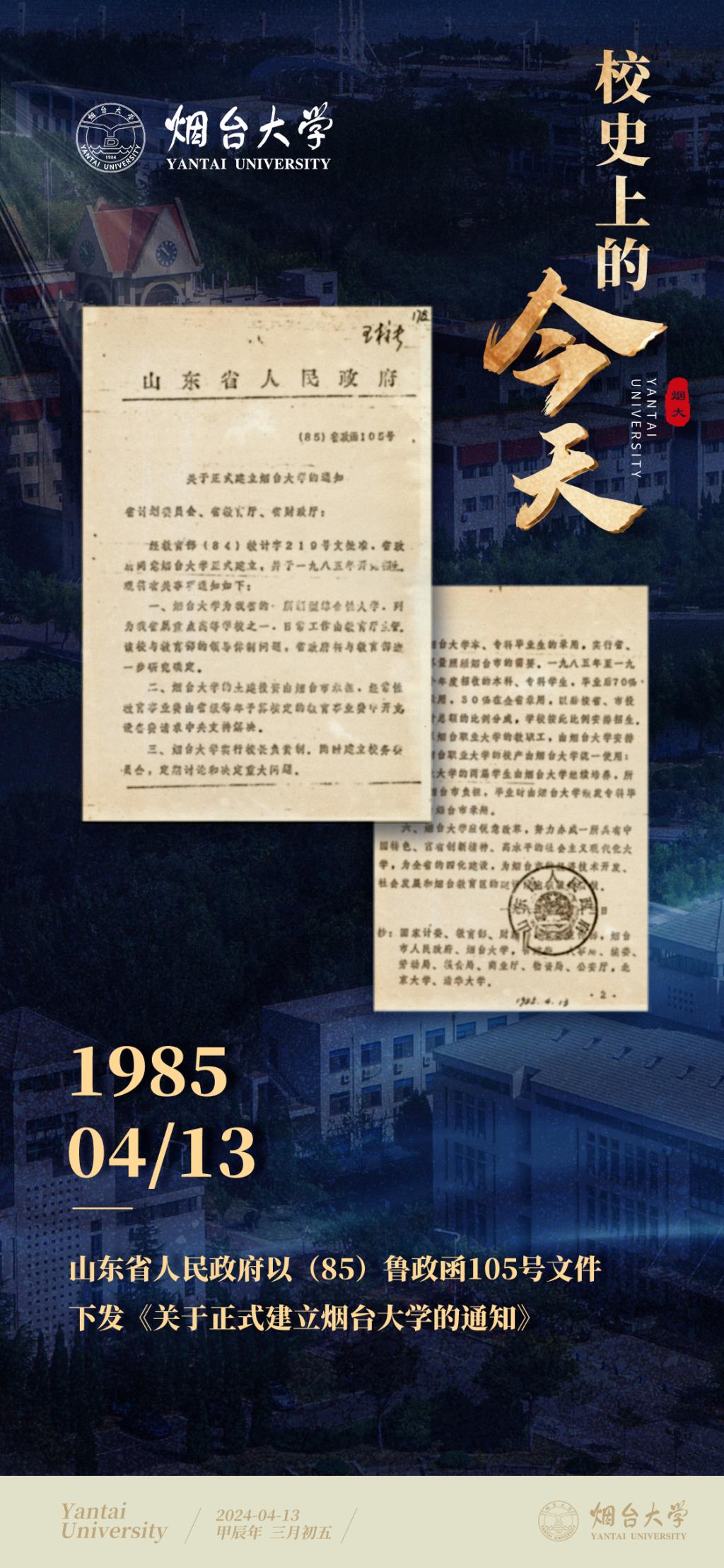 【編者按】2024年是新中國(guó)成立75周年,也是煙臺(tái)大學(xué)建校40周年。40年來(lái),誕生于改革開(kāi)放時(shí)代大潮中的煙臺(tái)大學(xué),植根齊魯文化沃土,傳承北大清華基因,弘揚(yáng)改革開(kāi)放精神,勇?lián)逃龔?qiáng)國(guó)使命,書(shū)寫(xiě)了一段段滋蘭樹(shù)蕙的育人故事,譜寫(xiě)了一曲曲乘風(fēng)破浪的奮進(jìn)贊歌。為慶祝煙臺(tái)大學(xué)建校四十周年,新聞中心(融媒體中心)推出“校史上的今天”欄目,以時(shí)間為線索,擷取煙大建校發(fā)展史上具有代表意義的重大事件,重溫閃耀在歷史長(zhǎng)河中的昔年今朝,追憶在鹽堿灘上白手起家、艱苦創(chuàng)業(yè)的崢嶸歲月,展現(xiàn)辦學(xué)歷程中取得的新發(fā)展成就,啟迪新時(shí)代煙大人在新征程中再創(chuàng)新輝煌。