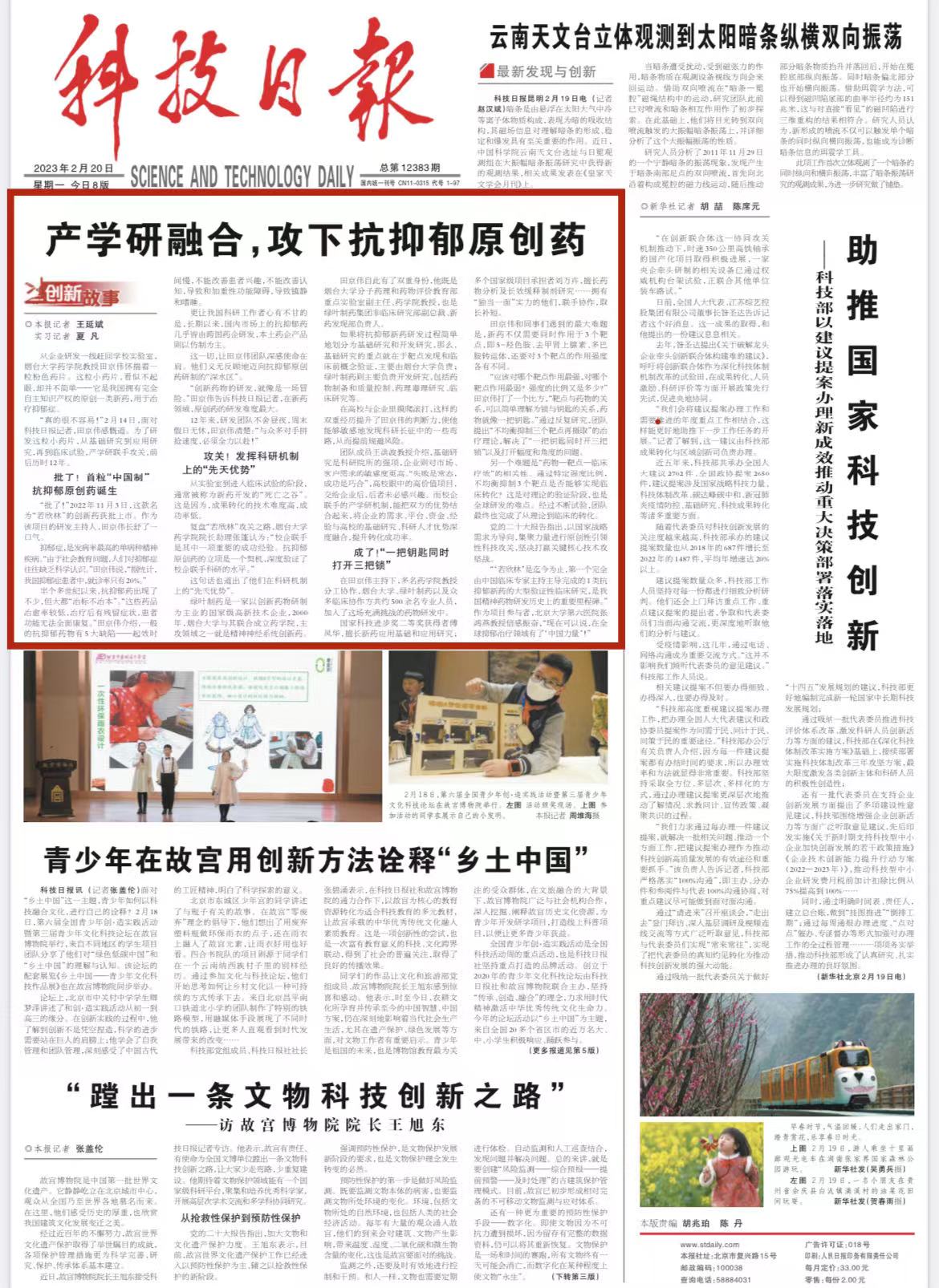 【本站訊】2月20日,《科技日報》頭版頭條“創新故事”專欄以《產學研融合,攻下抗抑郁原創藥》為題,專題報道了煙臺大學“產學研融合,攻下抗抑郁原創藥”的故事,引發師生和社會廣泛關注。現將原文刊載如下:
