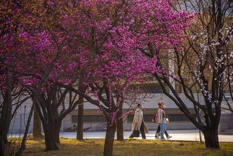 那今年春天的煙園是為什么由“粉黛漸次登場”變成“千紅競相綻放”呢?記者帶著疑問,采訪了后勤處物業服務中心工作人員。記者了解到,煙大的植物開花時間確實是主要集中在4月份。受今年溫度影響,3月份溫度整體上升比較快,玉蘭、連翹等早春開花植物花期得以適當延長,與紫荊、櫻花、美人梅等花期有了一定重合度。因此,今年才會出現百花香滿煙園的盛景。