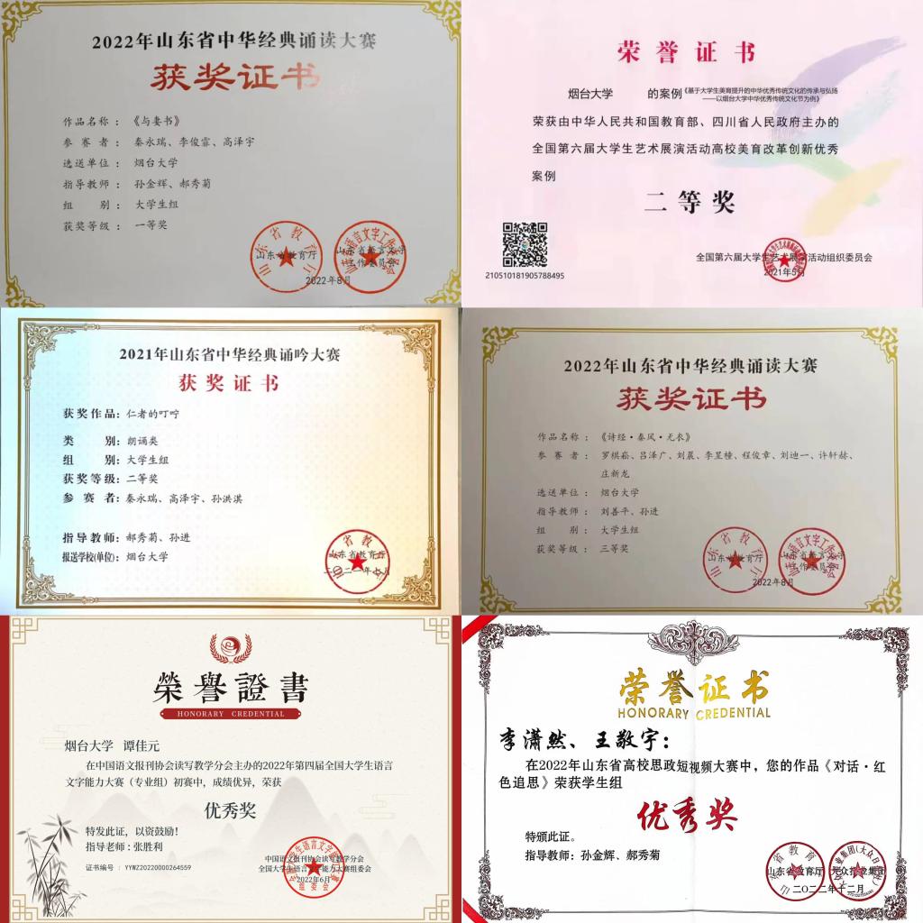 學院現有國家社科基金通訊評審專家1人,全國藝術科學規劃項目評審專家1人。學院5位教師獲“煙臺大學優秀教師”榮譽稱號,1位教師獲“煙臺大學優秀教育工作者”榮譽稱號,1位教師獲“煙臺大學優秀青年工作者”榮譽稱號。教學研究方面,學院獲山東省教學改革研究重點項目1項、一般項目2項;山東省青年教師教學比賽一等獎1項、優秀獎1項;山東省高校教師教學創新大賽一等獎1項,并被推薦參加第三屆全國高校教師教學創新大賽;山東省教師詩詞講解大賽一等獎1項。獲批省級在線精品課程立項1門,新增實踐教學基地20余個。研究生教育方面,學院獲山東省教學成果獎二等獎1項,山東省社會科學優秀成果獎三等獎1項,獲評省級教育教學改革項目1項,省級研究生優質課程2門,省級專業學位研究生教學案例庫建設項目1項,省級優秀成果獎指導教師2名。