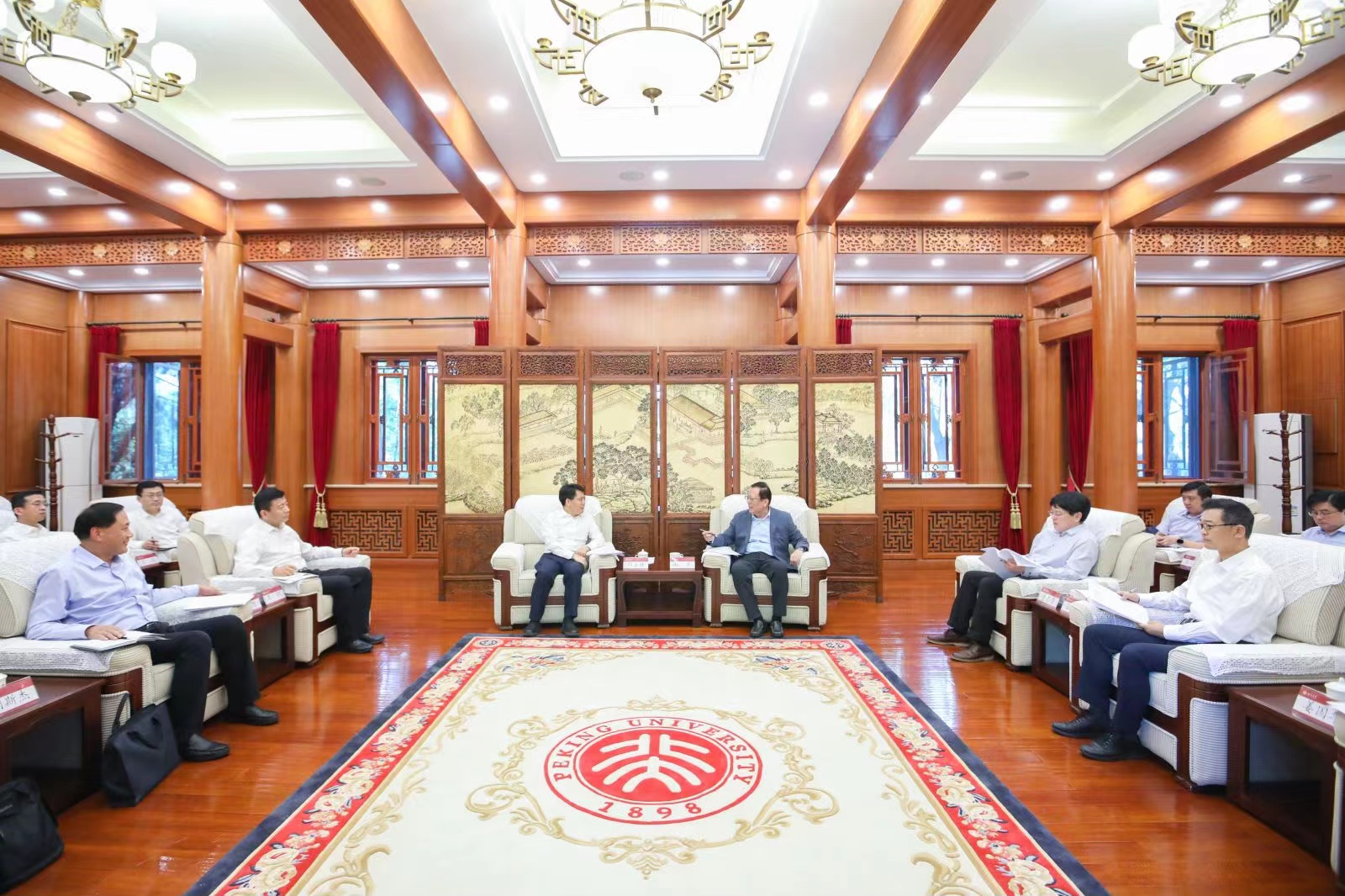 郝平對(duì)鄧云鋒一行的到訪表示歡迎,指出長(zhǎng)期以來(lái)北京大學(xué)始終高度重視與山東省的合作。作為援建煙臺(tái)大學(xué)的親歷者與見(jiàn)證者,郝平深情回顧了援建歷程,對(duì)煙臺(tái)大學(xué)近期取得的顯著辦學(xué)成績(jī)表示欣慰和祝賀。他指出,經(jīng)過(guò)共同努力,北京大學(xué)與煙臺(tái)大學(xué)在人才培養(yǎng)、學(xué)科建設(shè)、服務(wù)區(qū)域經(jīng)濟(jì)社會(huì)發(fā)展等多個(gè)領(lǐng)域建立了密切關(guān)系,取得了豐碩成果。面向未來(lái),北京大學(xué)愿意繼續(xù)與山東攜手,積極主動(dòng)融入新發(fā)展格局,抓住重點(diǎn)學(xué)科建設(shè)發(fā)力點(diǎn),進(jìn)一步完善援建煙臺(tái)大學(xué)和校地合作的長(zhǎng)效機(jī)制,實(shí)現(xiàn)雙方優(yōu)勢(shì)互補(bǔ),推動(dòng)山東高質(zhì)量發(fā)展和北京大學(xué)“雙一流”建設(shè)協(xié)同并進(jìn),推進(jìn)煙臺(tái)大學(xué)高水平大學(xué)建設(shè)、高質(zhì)量發(fā)展。