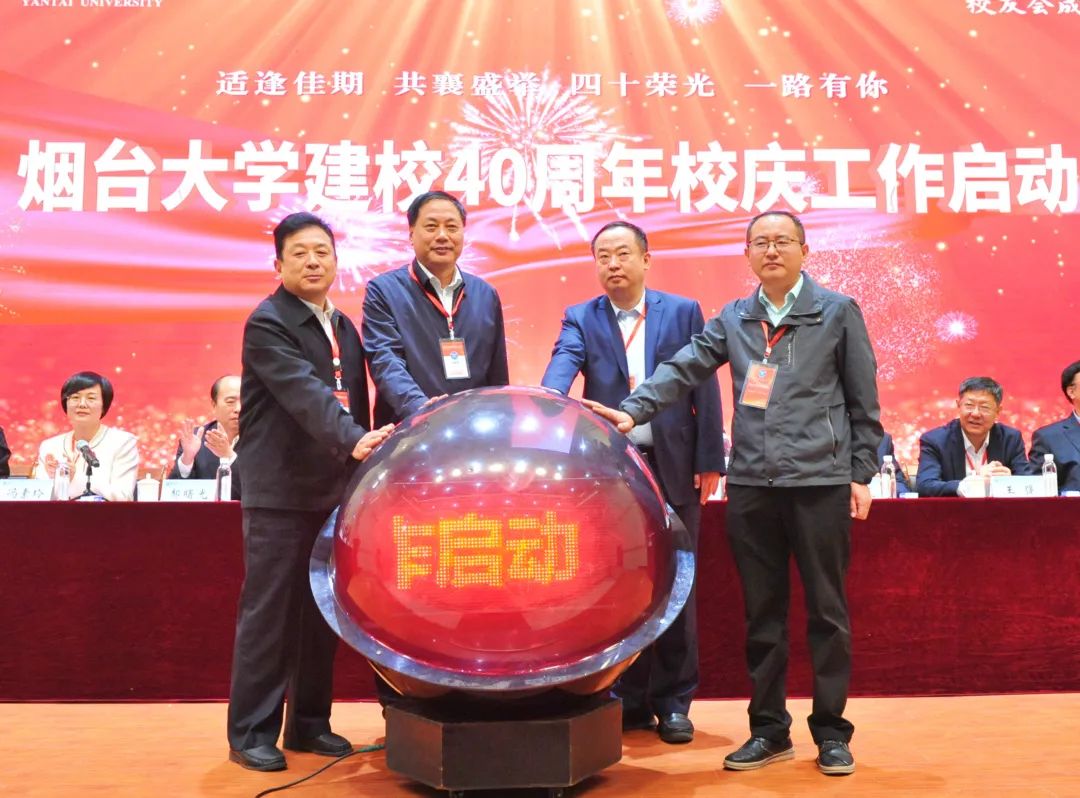在這個具有特殊意義的美好時刻,學校以校友會成立為契機,正式啟動煙臺大學40周年校慶工作。張殿臣、孫祥斌與陜西校友會會長、土木工程學院1996級校友、陜西高速星展科技有限公司董事長兼總經理邵永軍,青海校友會會長、生命科學學院1997級校友、中國科學院西北高原生物研究所研究員王洪倫共同按下煙臺大學40周年校慶啟動球。