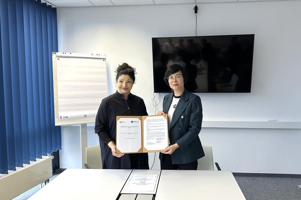在歐洲應(yīng)用技術(shù)大學(xué),代表團(tuán)與分管教學(xué)工作副校長(zhǎng)薩沙·波塞茨基、分管國(guó)際事務(wù)副校長(zhǎng)吉瑞·艾米納·格森教授進(jìn)行座談。馮素玲與吉瑞·艾米納·格森簽署了合作諒解備忘錄,并決定兩校在軟件工程專業(yè)開展雙元制聯(lián)合培養(yǎng)項(xiàng)目。