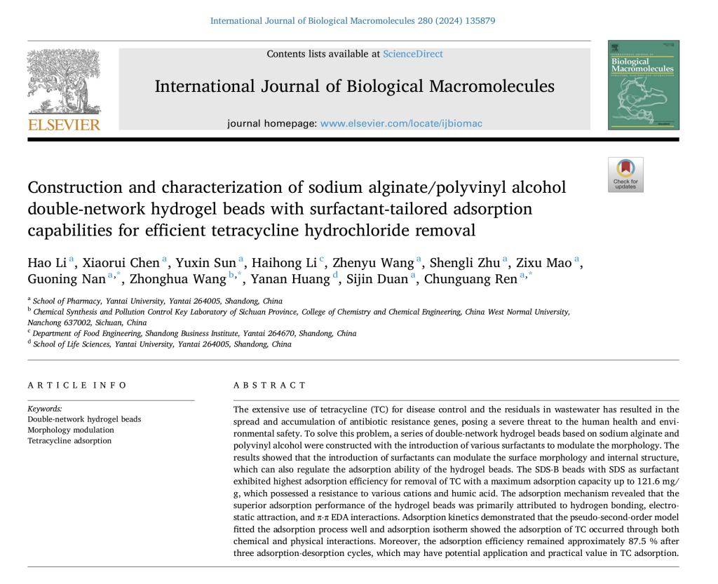 【本站訊】近日,煙臺大學(xué)藥學(xué)院2021級生物制藥專業(yè)本科生李浩為第一作者,藥學(xué)院教師任春光、南國寧以及西華師范大學(xué)王中華教授為共同通訊作者,以“基于表面活性劑調(diào)控的海藻酸鈉/聚乙烯醇雙網(wǎng)絡(luò)水凝膠微球的制備及其對四環(huán)素鹽酸鹽高效吸附性能的研究”為題,在國際權(quán)威期刊《國際生物大分子雜志》(中科院一區(qū)TOP)發(fā)表研究論文。
