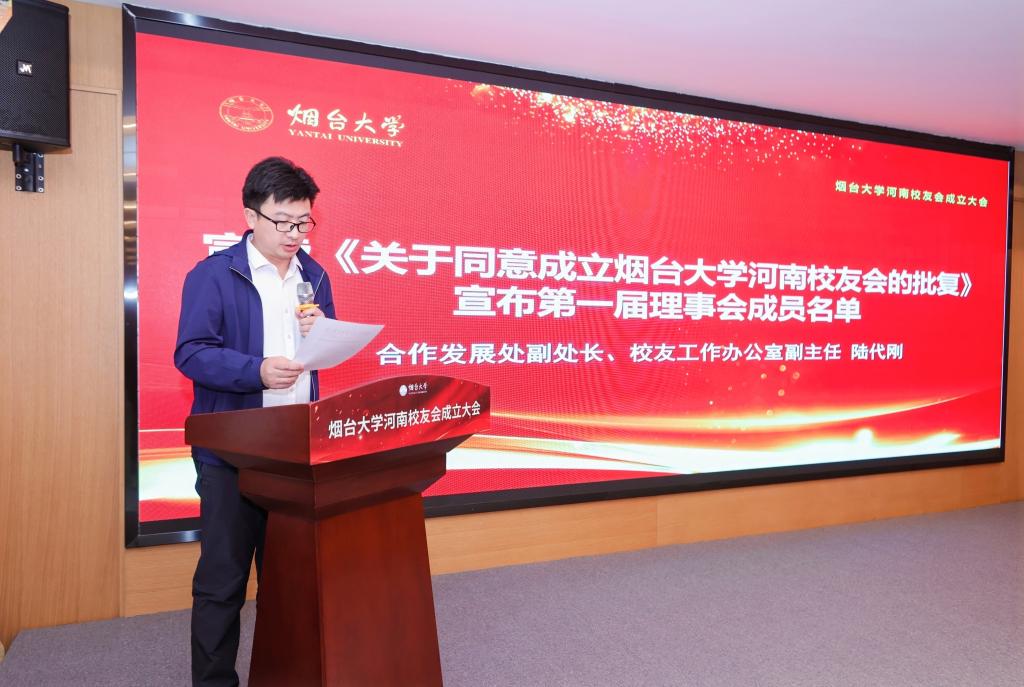 環境與材料工程學院2016級校友王開作煙臺大學河南校友會籌備工作匯報。合作發展處副處長、校友工作辦公室副主任陸代剛宣讀《關于同意成立煙臺大學河南校友會的批復》,并宣布理事會主要成員名單。