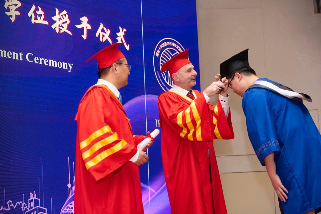 副校長王洪波與德國特里爾應用技術大學應用物質流管理研究院院長Peter Heck為畢業生撥穗正冠